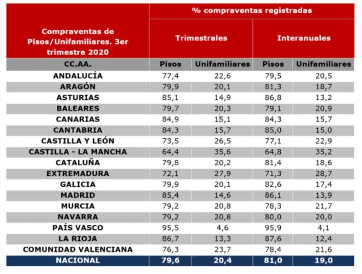 Ces résultats supposent que le poids des maisons unifamiliales a enregistré le maximum dans la série historique et le poids des logements collectifs son minimum historique. Et cela, malgré le fait que les ventes de maisons enregistrées ont diminué au cours du troisième trimestre de 16,6% par rapport au même trimestre de l’année précédente.