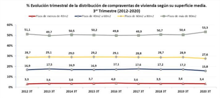 Les bureaux d’enregistrement brandissent que les données montrent que, au cours des douze derniers mois, les ventes d’appartements de plus de 80 m2 ont représenté 51,7%, nettement en dessous des 53,3% du dernier trimestre, montrant de manière significative la tendance à étages plus grands.