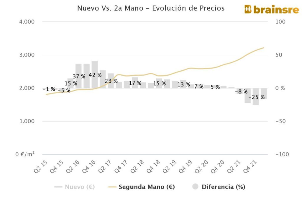 Dans le cas des nouvelles constructions, le prix s’élève à 2.705 euros par mètre carré, soit 4 % de moins qu’il y a un an, tandis que les biens d’occasion ont augmenté de 16 % pour atteindre 3.211 euros par mètre carré. De même, en comparaison trimestrielle, les prix des logements nouvellement construits ont augmenté de 15 % et ceux des logements de seconde main de 2,6 %.