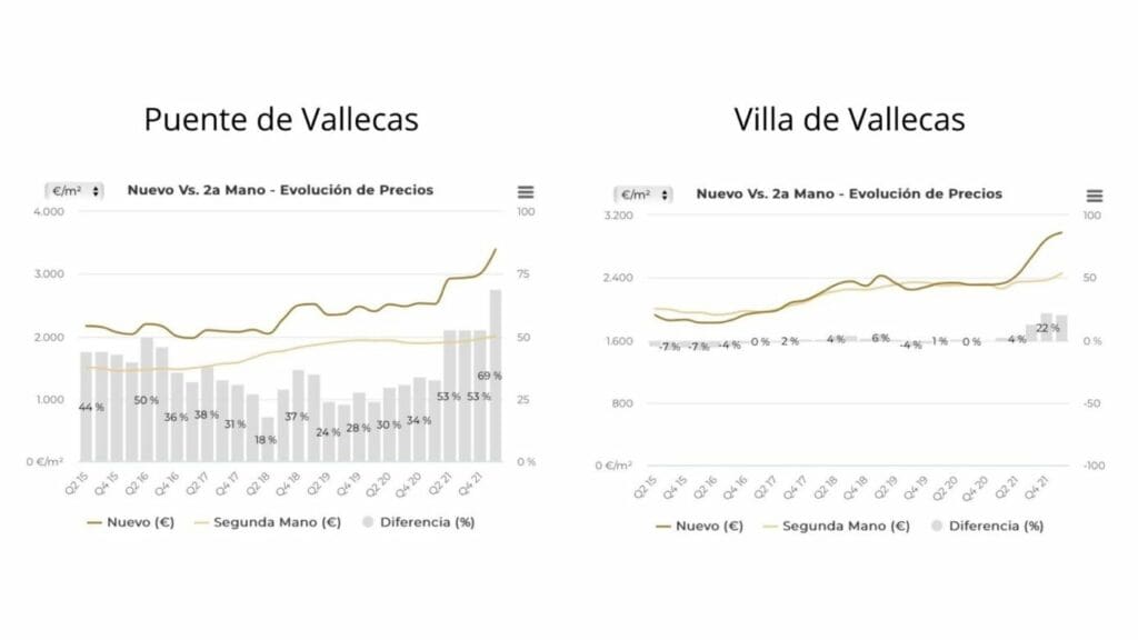 La différence entre l’achat d’une propriété neuve ou de seconde main est notable à Puente de Vallecas, où la construction neuve se vend à 3.394 €/m² et la seconde main à 2.004 €/m², avec une différence de 69%. A Villa de Vallecas, la différence est beaucoup plus faible, seulement 21%, avec des prix de 2.978 €/m² pour le résidentiel neuf et 2.458 €/m² pour le résidentiel d’occasion.