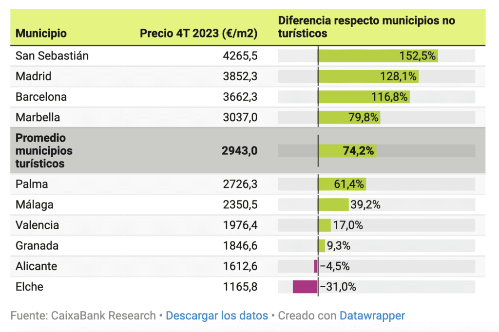 CaixaBank Research répertorie 64 municipalités comme villes touristiques, avec un prix moyen de 2.943 €/m2. En 2023, la différence avec le reste des villes est maximale.