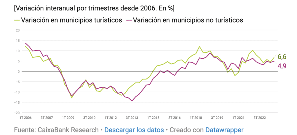 Si l’on se concentre sur les données les plus récentes, l’augmentation en glissement annuel des prix des logements dans les lieux touristiques s’est élevée à 5,7% au cours du 1er trimestre de l’année dernière, contre une moyenne de 4,8% enregistrée dans le reste du marché. Au printemps, la hausse a été de 4,6%, soit 3/10ème de point de pourcentage de plus que dans les communes non touristiques, tandis qu’en été, l’augmentation a été de 6,6% dans les marchés touristiques, contre 4,9% dans ceux qui n’en font pas partie. En fin d’année, la tendance s’est poursuivie, avec une augmentation de 7,5% dans les localités touristiques et de 5% dans les autres.