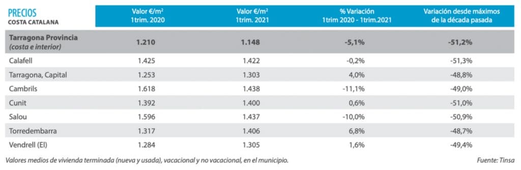 La valeur au début du cycle immobilier post-crise a été marquée par le volume important de biens en provenance des banques, influençant considérablement une baisse des prix et marquant un pic baissier. avec un accès direct à la plage en 2016 et au cours des périodes suivantes, les prix ont montré une évolution favorable et continue, identifiant une nette tendance à la hausse en 2018 et des villes comme Salou et Cambrils montrant un plus grand dynamisme des prix et des villes comme Miami Playa avec des valeurs ​ci-dessous. En 2019, on ne s’attendait pas à une hausse des prix beaucoup plus élevée.