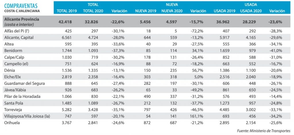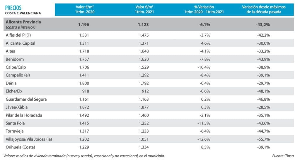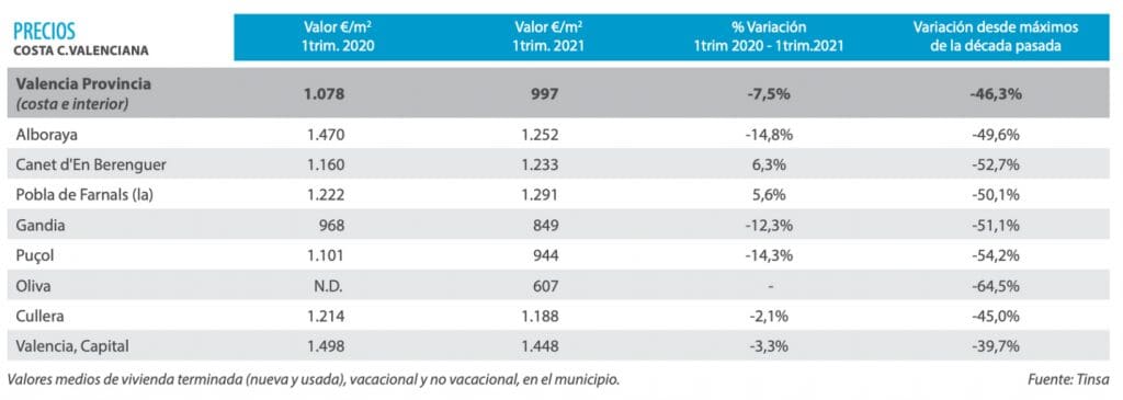 Des baisses allant jusqu’à 15 % ont été enregistrées. La plupart des populations de la région de L`Horta Nord ont suivi la même tendance, à l’exception des endroits qui ont connu des augmentations allant jusqu’à 5 %. Les prix de la construction neuve se stabilisent tandis que les prix de l’occasion baissent. L’absence d’étrangers a pesé sur la demande et fait baisser les prix sur le littoral.