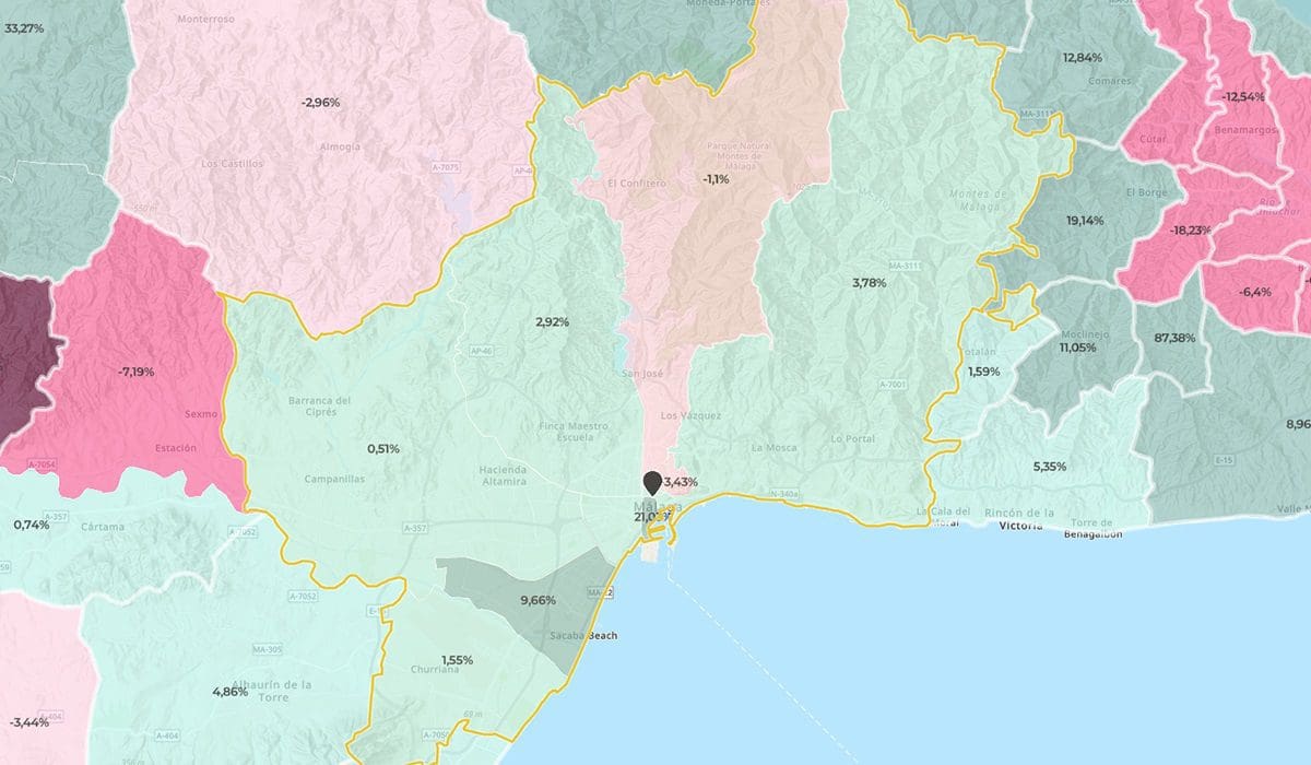 Plus précisément, le logement a augmenté dans l’Est de Malaga de 3,8 % par an, à 2.794 euros par m2 ; à Málaga Norte, 2,9 %, jusqu’à 1.613 euros par m2 ; à Carretería et Álamos, 1,9 %, jusqu’à 3.500 euros par m2, à Churriana, 1,6 %, jusqu’à 1.748 euros par m2, et à Ronda Intermedia-Campanillas, 0,5 %, jusqu’à 1.807 euros par m2.