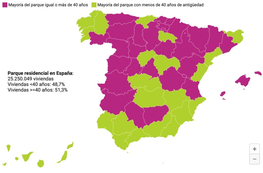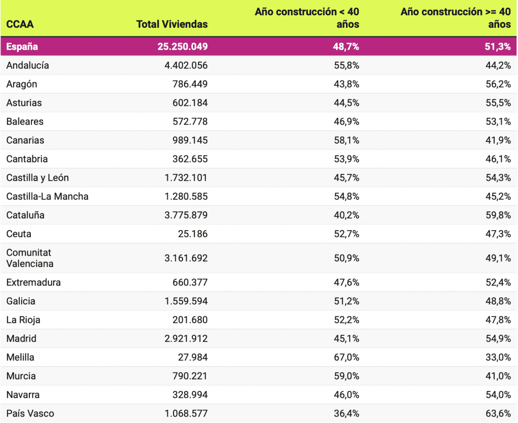 Par communautés autonomes, celles qui ont un parc plus ancien se trouvent en Euskadi (63,5%), en Catalogne (59,8%) et en Aragon (56,2%). Six autres régions autonomes, les Asturies, Madrid, Castille-et-León, Navarre, les îles Baléares et l’Estrémadure, ont également plus de 50 % de leurs logements qui ont 40 ans ou plus.