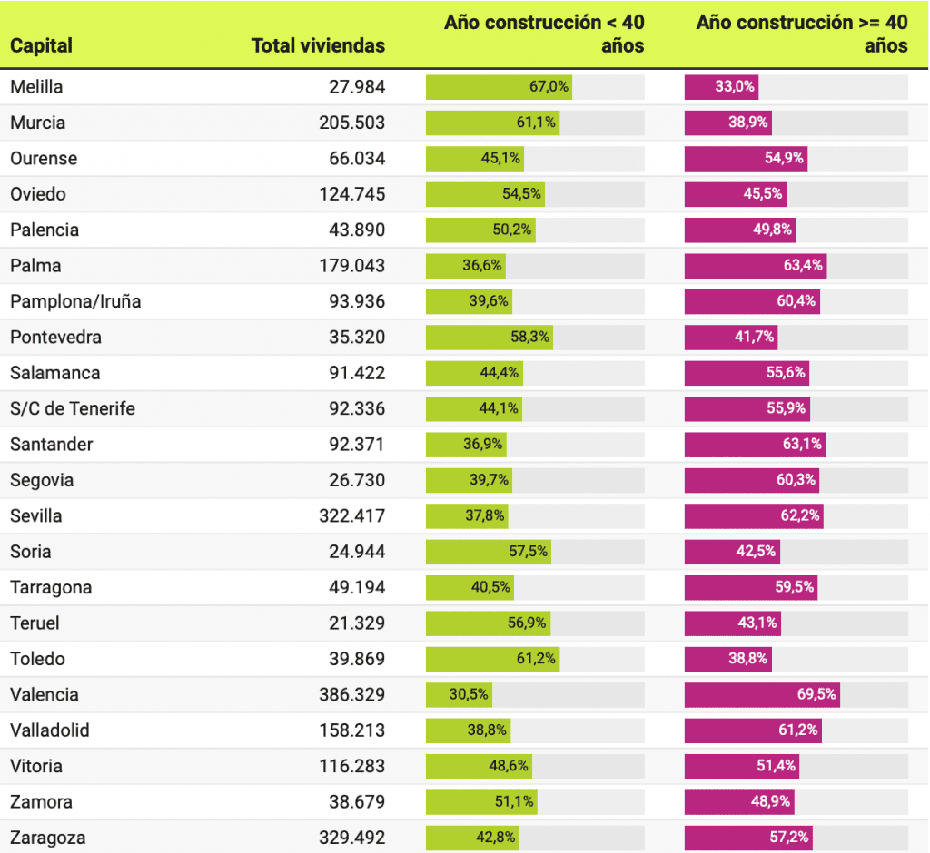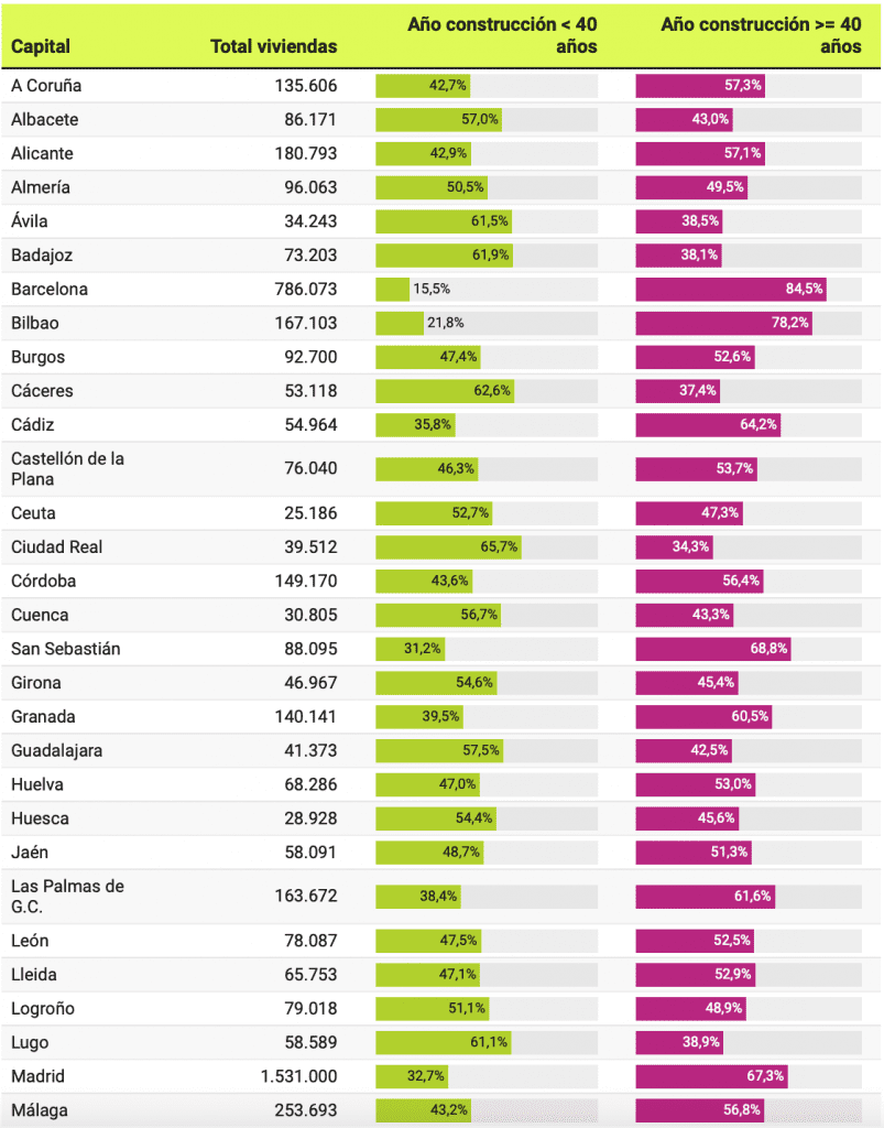 Concernant l’âge du parc résidentiel dans les capitales provinciales, les villes confirment généralement la tendance pour l’ensemble de la région, comme Barcelone ou Bilbao, où 84,5% et 78,2% de leurs logements, respectivement, ont plus de 40 ans. Au total, 30 des 52 capitales provinciales possèdent principalement des logements susceptibles de nécessiter une aide pour la réhabilitation de ces bâtiments.
