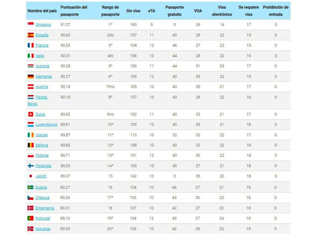 Le passeport espagnol se classe au 2ème rang mondial pour sa solidité, sur la base de facteurs tels que l’accès sans visa, le visa à l’arrivée, les eVisas et la mobilité mondiale, utilisés par VisaGuide.World dans son système de classement, qui évalue 199 pays et territoires.