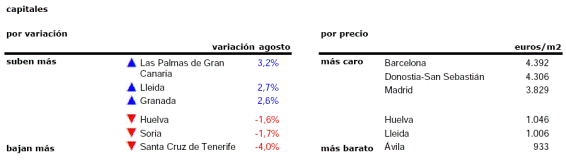 Au cours du mois d’août, le nombre de capitaux a augmenté de 35. L’augmentation la plus marquée est celle de Las Palmas de Gran Canaria, où les attentes des propriétaires ont augmenté de 3,2%. À Lleida, la hausse a été de 2,7%, contre 2,6% à Grenade. À Madrid, les prix ont augmenté de 0,8% et à Barcelone de 0,1%. Santa Cruz de Tenerife, en revanche, a enregistré la plus forte baisse ce mois-ci (-4%), suivie par Soria (-1,7%) et Huelva (-1,6%).