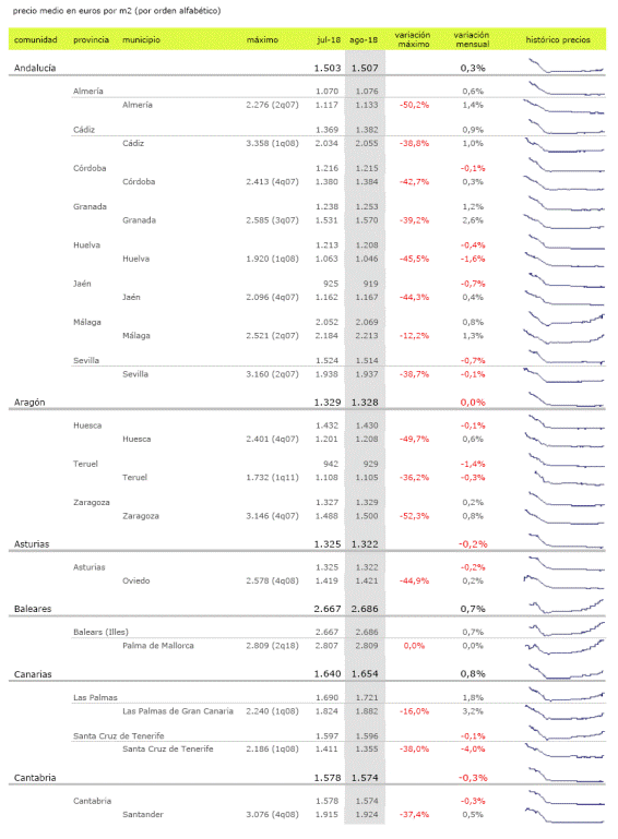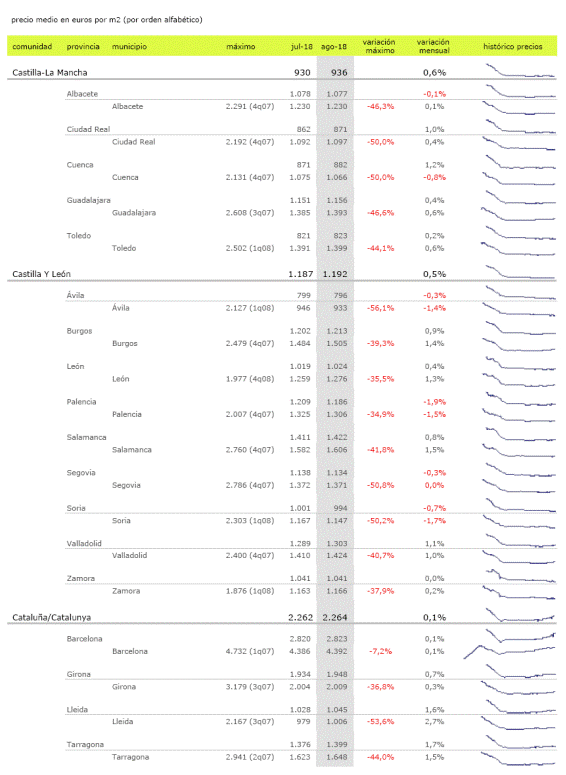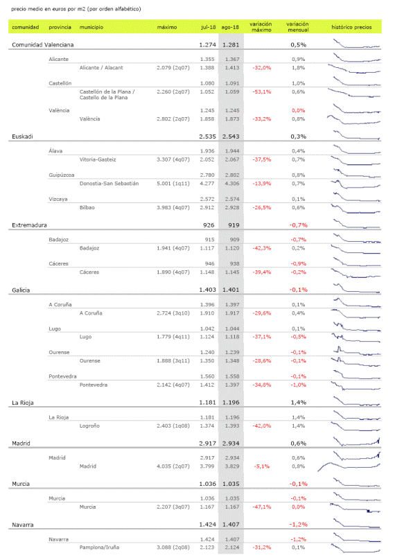 Le classement des provinces les plus chères est mené par Madrid avec 2.934 euros / m2. Barcelone (2.823 euros / m2) et Guipúzcoa (2.802 euros / m2) viennent en deuxième position.