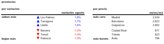 28 provinces enregistrent des prix plus élevés que le mois précédent. La plus forte augmentation a été enregistrée à Las Palmas (1,8%), suivie par Tarragone (1,7%), Lleida (1,6%) et La Rioja (1,4%). La chute la plus importante a toutefois eu lieu à Palencia, où les propriétaires demandent 1,9% de moins pour leurs maisons. Ils sont suivis par les chutes de Teruel (-1,4%) et de Navarre (-1,2%).