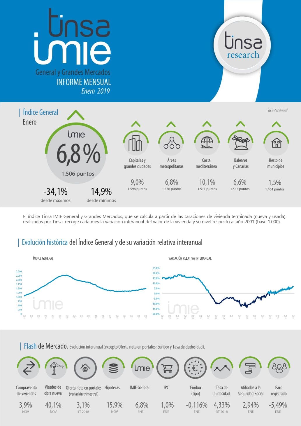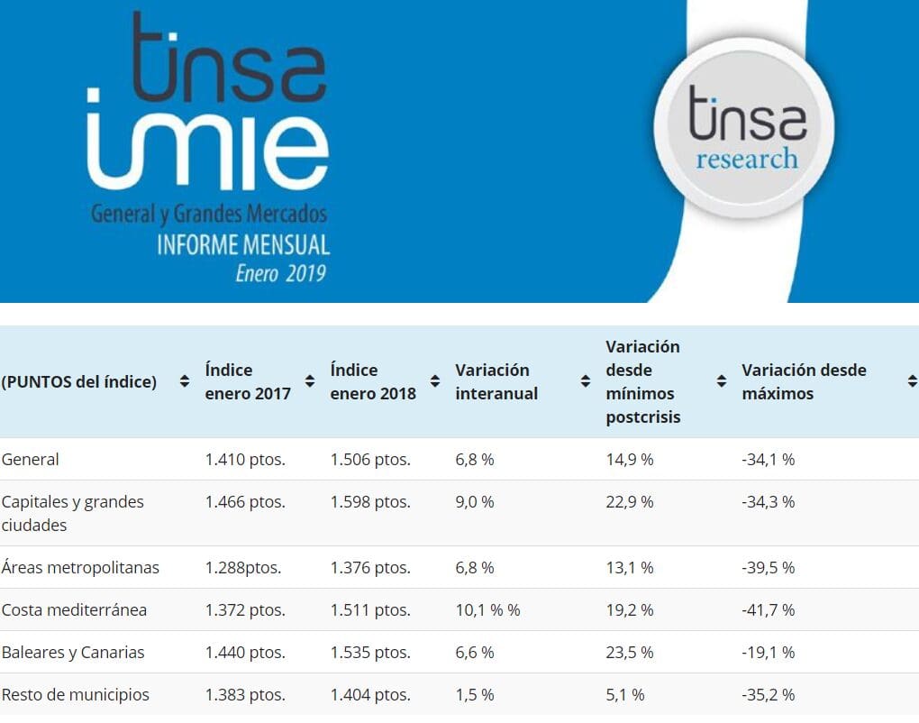 L’indice Tinsa IMIE General, qui reflète l’évolution de la valeur moyenne des logements finis (neufs et d’occasion) en Espagne, a enregistré une augmentation d’une année sur l’autre de 6,8% en janvier; cette variation est supérieure de trois dixièmes à celle de décembre 2018. En valeur annuelle, ce sont la côte méditerranéenne, les capitales et les grandes villes qui ont enregistré la plus forte appréciation (10,1% et 9,0%, respectivement), tandis que les municipalités situées à l’intérieur de la péninsule ont enregistré des prix nettement inférieurs (1,5%). Les zones métropolitaines et les territoires insulaires affichent des chiffres proches de la moyenne nationale, proches de 7%. En termes de variation mensuelle de la valeur, les zones métropolitaines de janvier se distinguent, avec une variation de pratiquement 2% par rapport à décembre 2018, reflétant le transfert des hausses de prix du centre des grandes villes à sa périphérie, après des années de hausse notable des prix dans les principaux districts. Les îles Baléares et Canaries, avec une augmentation mensuelle de 1,6%, présentent également des variations importantes. Le reste des zones géographiques ont enregistré des augmentations plus modérées, entraînant une augmentation mensuelle de 0,8% dans l’ensemble de l’Espagne.