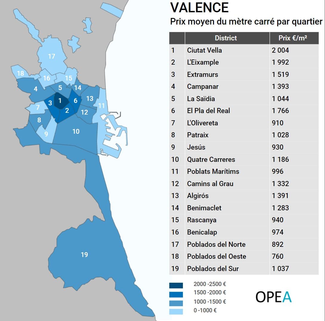 Vivre dans la zone de Gran Via Marques del Turia (l’Ensanche) coûte nettement plus cher que vivre dans les zones Nord et Ouest nettement plus accessibles ; à Valencia, un logement peut valoir trois fois plus cher selon sa situation géographique.