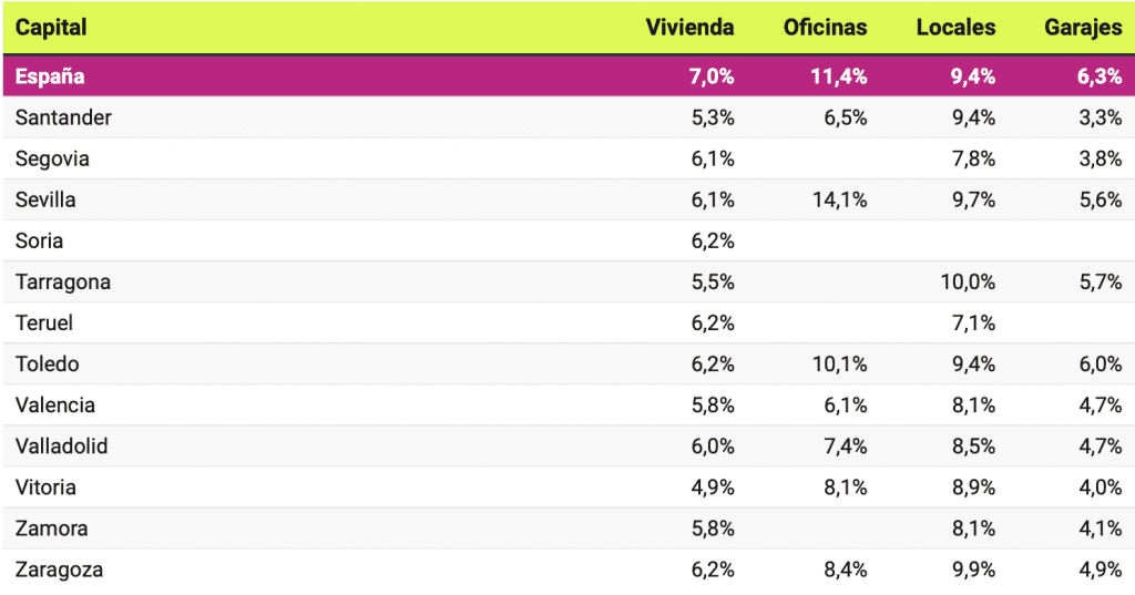 Les locaux sont le produit avec la rentabilité la plus élevée dans presque toutes les capitales. Le rendement le plus élevé est obtenu à Lugo (13,3%). Il est suivi des retours de Huelva (10,7%), Ávila (10,3%), Oviedo (10,3%), Tarragona (10%), Saragosse, Burgos et Huesca (9,9% dans les trois cas). À Barcelone et à Madrid, le taux s’élève respectivement à 8,3 % et 7,9 %.