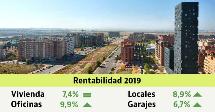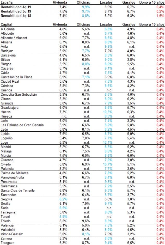 Les locaux sont le produit le plus rentable dans presque toutes les capitales. Les rendements les plus élevés sont obtenus à Lugo (12,1 %), Oviedo (10,7 %), Huelva (10,3 %), Avila (9,9 %) et Séville (9,7 %). Elles sont suivies par les villes de Pontevedra (9,5 %), Saragosse (9,4 %) et Santa Cruz de Tenerife (9,3 %). À Barcelone, le taux était de 8,3 %, soit le même niveau que celui enregistré à Madrid.