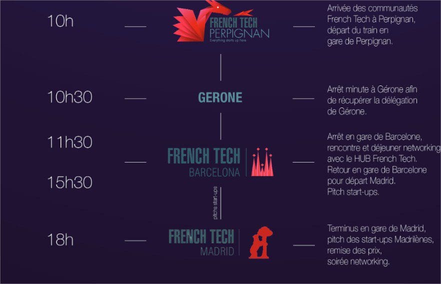 Au départ de la gare de Perpignan à destination de Madrid, une séléction de startups des Pyrénées Orientales, de Marseille, Toulouse et Montpellier mais aussi de Gérone, Barcelone et Madrid est invitée à présenter les différents projets dans un train devant des investisseurs, banques et institutions.