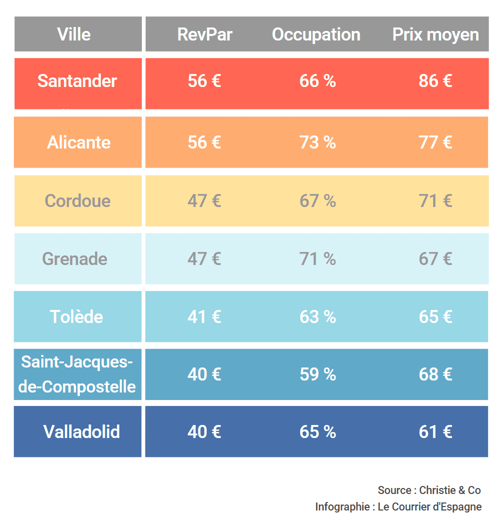 Santander est la ville avec le prix moyen le plus élevé, atteignant 86 euros, suivie par Alicante (77 euros) et Cordoue (71 euros). À la dernière place, on trouve Valladolid qui, malgré une croissance notable de ses niveaux de RevPar (en hausse de 19,3% en 2017 par rapport à 2016), a un prix moyen de 61 euros, le plus bas des villes analysées. Ainsi, en termes de niveaux RevPar, la liste est dirigée par Santander et Alicante, toutes les deux avec un prix de 56 euros, suivies de Cordoue et Grenade, 47 euros.