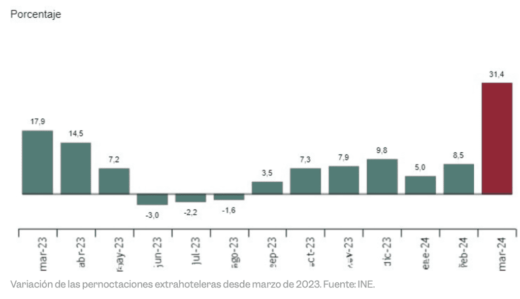 Les appartements touristiques ont représenté plus de la moitié des nuitées non hôtelières en mars, avec 4,88 millions. Ce chiffre se traduit par une augmentation de 18,8% par rapport au même mois de 2023. L’indice des prix des appartements touristiques (IPAT) a augmenté de 12,9%.