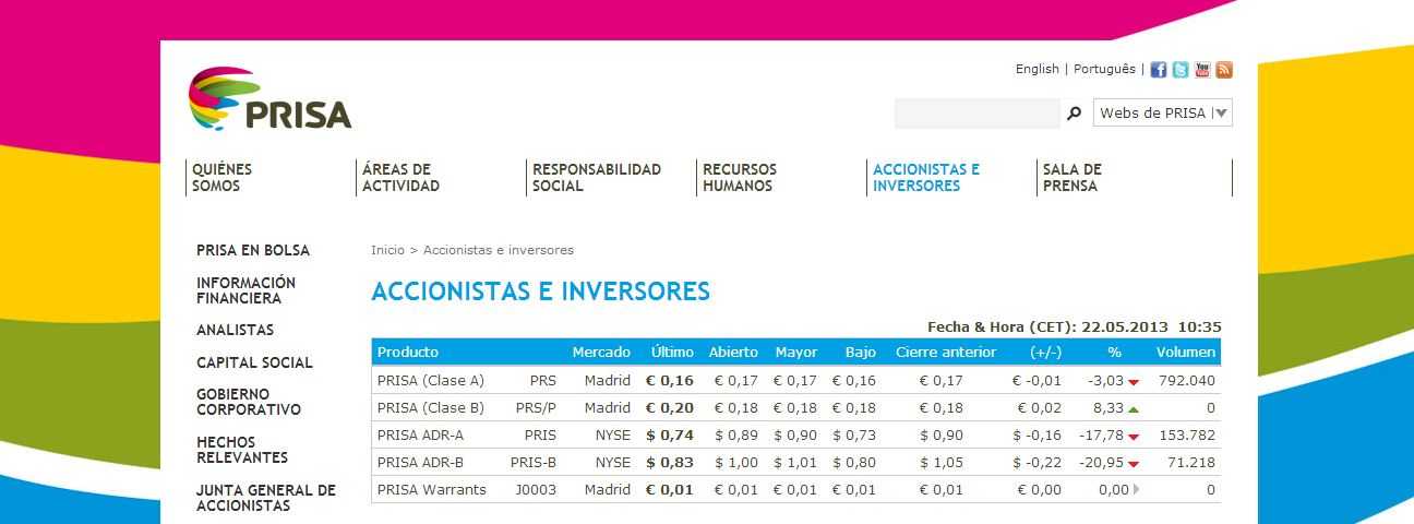 Selon les informations transmises par l’Organisme Fédéral Américain de Réglementation et de Contrôle des Marchés Financiers, les investisseurs étrangers et en particulier les investisseurs américains délaissent les capitaux du groupe espagnol Prisa, Promotora de Informaciones Sociedad Anónima. Depuis 6 mois, différentes banques ont commencé à se détacher des capitaux de la société espagnole. Goldman Sachs, la banque dirigée par Lloyd Blankfein, a réduit son nombre d’actions de presque 50%. Elle comptait 2,20 millions de titres à son actif au troisième trimestre 2012 contre 1,04 millions à la fin du premier trimestre 2013. Le 31 mars 2013, Goldman possédait un investissement dans la société Prisa d’une valeur de 1,15 millions de dollars. Cet investissement était de 4,19 millions à la fin du mois de septembre 2012. La banque suisse UBS a également choisi de réduire sensiblement ses investissements. Au début de l’année 2013, elle s’est séparée de 29.570 actions Prisa. Aujourd’hui ses parts s’élèvent à 713.815. Quant à Citigroup, elle s’est séparée au cours du premier trimestre 2013 de 386.648 des parts. Au même moment, d’autres fonds de taille plus modestes ont liquidé leur investissement dans la compagnie, entre autre Cheyne Capital, Wolverine Asset, FNY Managed Accounts y Financial Architects. Dans son rapport annuel, Prisa reconnait avoir « une dette assez conséquente » et que ceci a pu affecter négativement son flux de liquide et sa capacité à mener à bien ses affaires. Prisa souligne que le paiement des dividendes pourraient être mis en danger compte tenu de la situation. La société Prisa est née en 1976 avec la création du journal El País, aujourd’hui elle est présente sur les types de médias espagnols, les journaux AS, Cinco Días, la chaîne de télévision Localia, les radios Cadena SER et Los 40 Principales ou encore le groupe d’édition Santillana. La société s’est progressivement internationalisée en Amérique du Sud, aux États-Unis, au Portugal et en France, où elle est actionnaire à 15 % du groupe Le Monde.