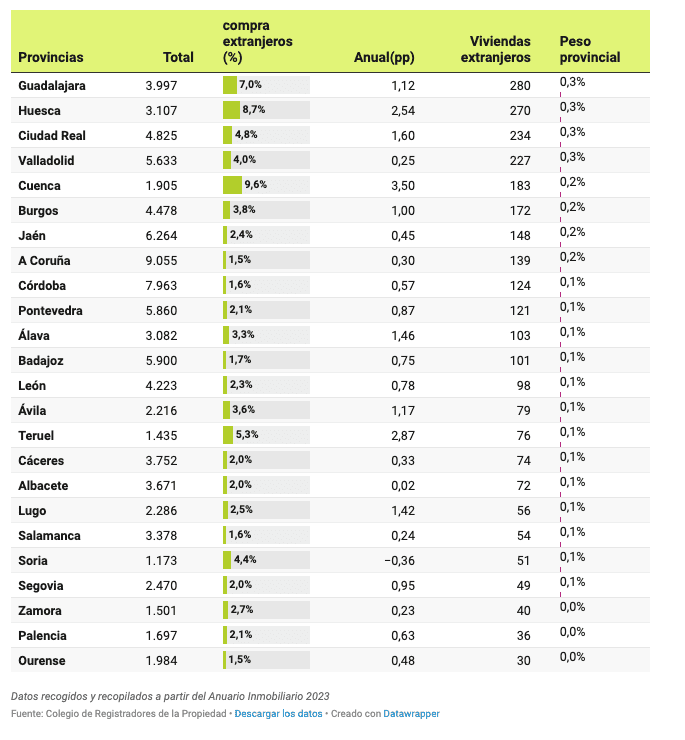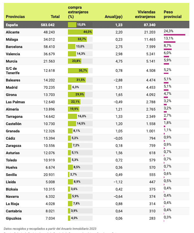 Au niveau provincial, la tendance se poursuit et le poids le plus important des achats de logements par des étrangers se trouve à Alicante (44%), qui se rapproche de plus en plus de la moitié de toutes les transactions. Elle est suivie par Santa Cruz de Tenerife (35,7%), Malaga (33,7%), les îles Baléares (31,5%), Girona (29,9%), Murcia (23,8%), Las Palmas (22,1%), Almeria (19,9%), Tarragona (16%) et Castellon (14,5%).