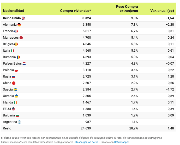 Par nationalité, les Britanniques conservent leur leadership traditionnel (9,5%), avec plus de 8.100 transactions, mais ils ont de moins en moins de poids relatif dans le nombre total d’achats de logements par des étrangers. Cette année, ils ont diminué de 1,54 pp. Ils sont suivis par les Allemands (7,3%), avec plus de 6.200 transactions, et les Français (6,7%), avec plus de 5.700 transactions, ce qui maintient le trio de tête des nationalités, mais ils perdent également du poids, avec respectivement 2,2 pp et 0,32 pp de moins.