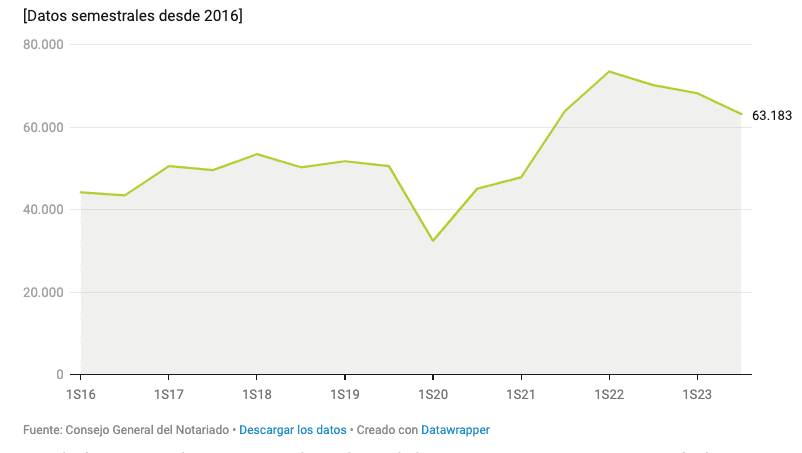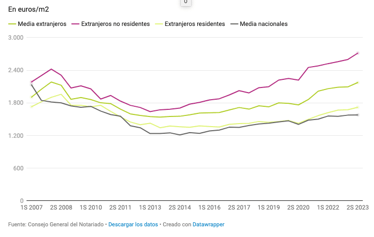 Les étrangers paient un prix sans précédent pour acheter une maison en Espagne. Selon les données des notaires, les non-résidents ont payé en moyenne 2.715€ par m2 de propriété au 2ème semestre 2023, soit une hausse de 6,1% en glissement annuel et le chiffre le plus élevé de toute la série historique.