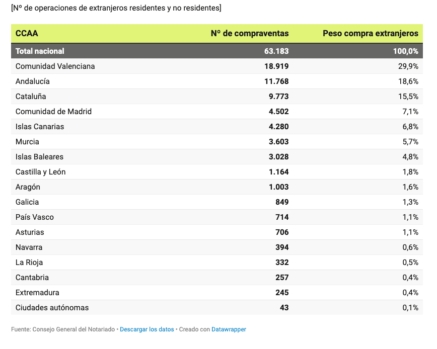 Si l’on considère le nombre total de ventes et d’achats, la Communauté valencienne reste en tête du classement national avec 18.919 unités, ce qui représente 29,94% du total. En d’autres termes, 3 maisons sur 10 achetées par des étrangers en Espagne se trouvent dans cette région. Depuis des mois, la région de Levante est le moteur du marché immobilier, et pas seulement pour les acheteurs étrangers. La région autonome enregistre également plus de transactions que Madrid et la Catalogne dans le secteur domestique.