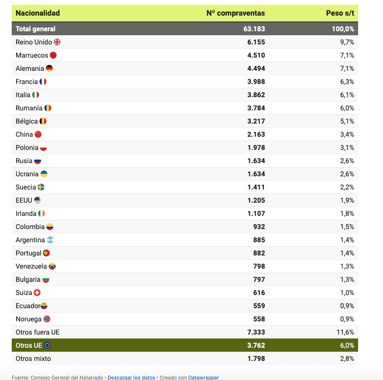 Parmi les étrangers résidents, les Marocains et les Roumains ont été les principaux acheteurs presque partout dans le pays, sauf en Galice, à Valence et dans les archipels, où la part des Portugais, des Britanniques, des Allemands et des Italiens a été plus importante, respectivement.