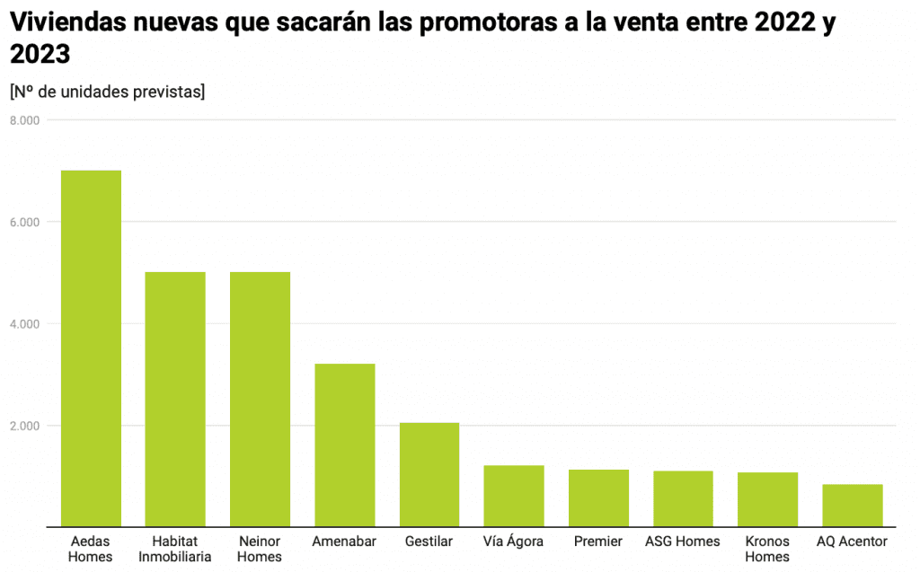 Neinor Homes, qui était en 2021 le développeur avec le plus de logements sur le marché, est troisième du classement. Il a projeté environ 5.000 unités entre cette année et l’année prochaine, réparties sur une soixantaine de promotions.