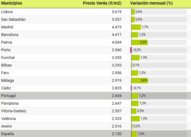 Dans le cas de Lisbonne, le prix moyen est passé à 5.619 euros/m2, soit une augmentation de 0,6%. Ce prix est non seulement plus du double de la moyenne du pays dans son ensemble, mais il est également beaucoup plus élevé que celui des principales villes espagnoles, qui ont pourtant atteint des sommets.