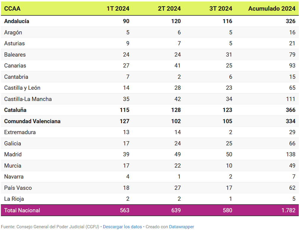 Du côté des augmentations, on trouve la Cantabrie (avec une augmentation de 500% d’une année sur l’autre), la Catalogne (173%), la Castille et Léon (130%) et le Pays basque (112%). L’Andalousie (81%), la Castille-La Manche (79%), les Baléares (63%), la Communauté valencienne (56%) et la Navarre, qui est passée de 0 à 2 procédures, se situent également au-dessus de la moyenne nationale.
