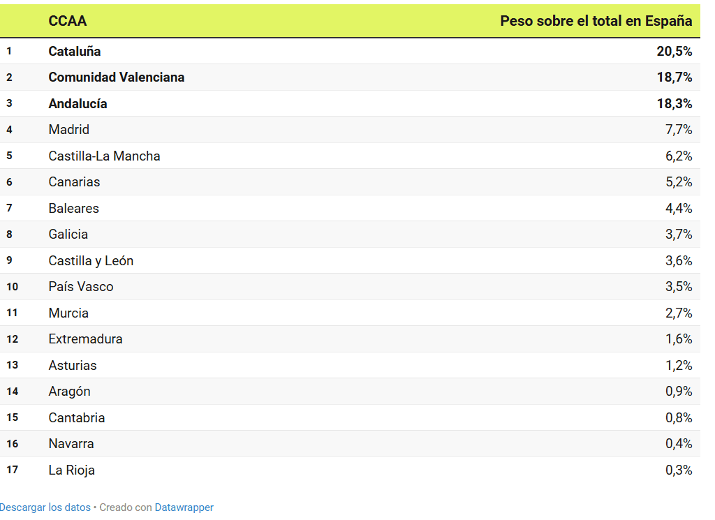 La Catalogne, l’Andalousie et la Communauté valencienne sont les habitués du haut du tableau, mais pas toujours dans le même ordre. Au cours des 3 premiers mois de l’année, par exemple, c’est la région de Valence qui était en tête du classement, bien que depuis lors, la 1ère place soit occupée par son homologue catalane.