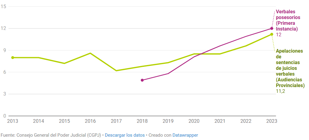 Les données du Conseil général du pouvoir judiciaire confirment la théorie des experts selon laquelle les squats ne diminuent pas, comme le suggèrent les données sur les plaintes collectées par le ministère de l’Intérieur. Dans leur cas, les statistiques les plus récentes font état de 15.289 plaintes déposées auprès de la police pour l’ensemble de l’année 2023, incluant à la fois les délits d’effraction et d’usurpation du droit d’usage d’un bien, qui sont tous 2 des délits pénaux.
