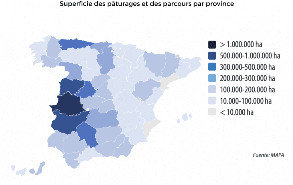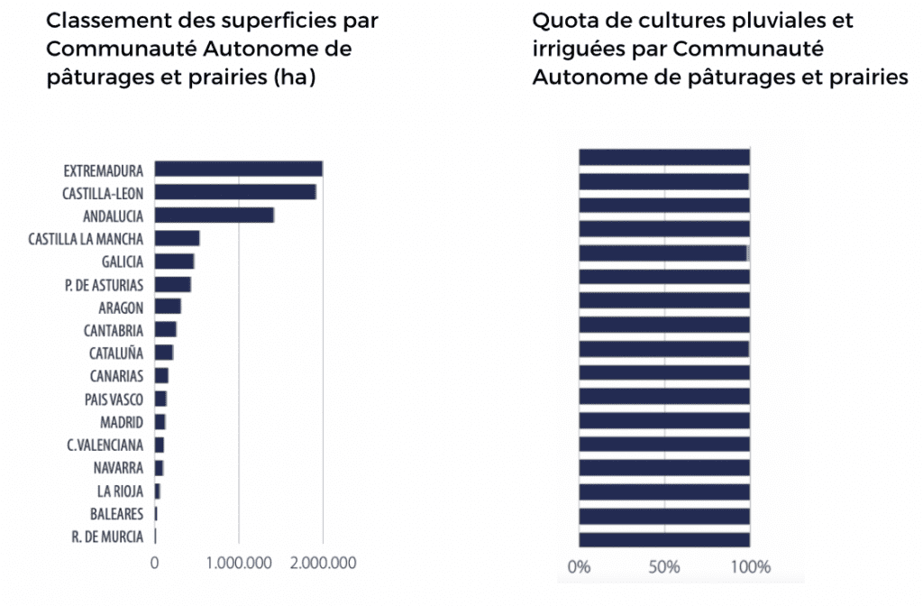 Augmentation considérable de la superficie des prairies et pâturages dans la Communauté valencienne (+63% au cours des 5 dernières années, jusqu’à 110.400 ha en 2022) et à Murcie (+88% au cours des 5 dernières années, jusqu’à 12.000 ha)