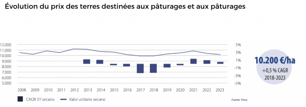 Sec. Tendance à la hausse au cours de la période 2017-2021 et tendance à la contraction au cours des deux dernières années, en partie à cause des attentes liées à l’application de la nouvelle PAC. Au cours des 5 dernières années, une croissance moyenne de +0,5% a été enregistrée. En 2023, la valeur moyenne des pâturages et pâturages est de 10.200 €/ha.
