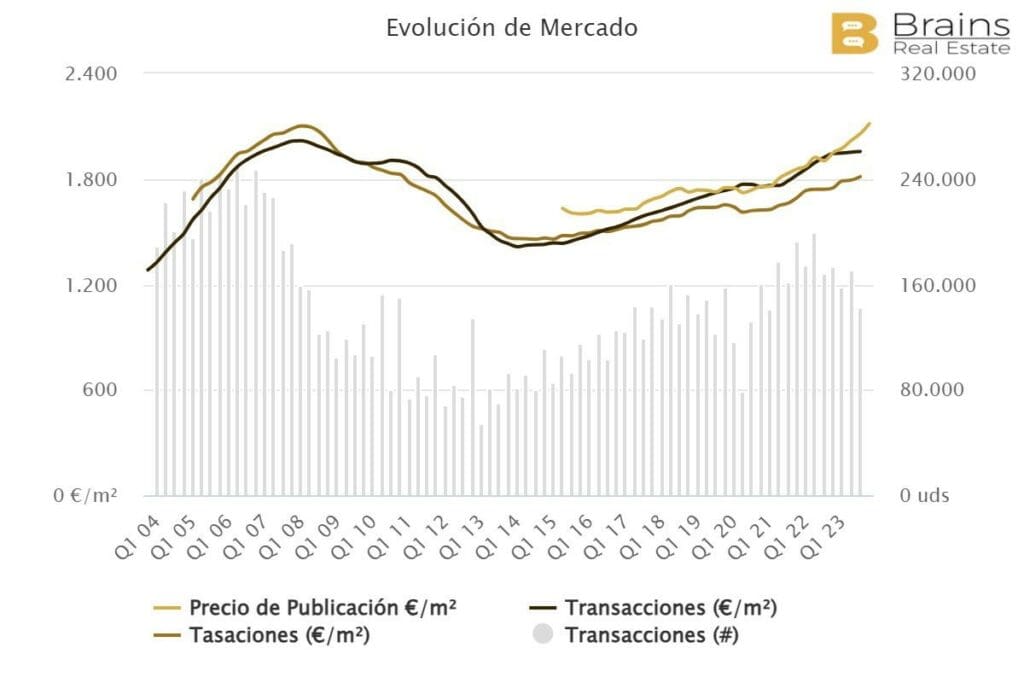 Le prix de vente des logements en Espagne n’a cessé d’augmenter depuis le 3ème trimestre 2022, s’établissant actuellement à 2.114 € par m2. Au cours des 12 derniers mois, les prix ont augmenté de 8,4%, tandis qu’en glissement trimestriel, ils ont progressé de 2,8%, selon les données obtenues auprès de la plateforme de big data immobilière Brainsre.