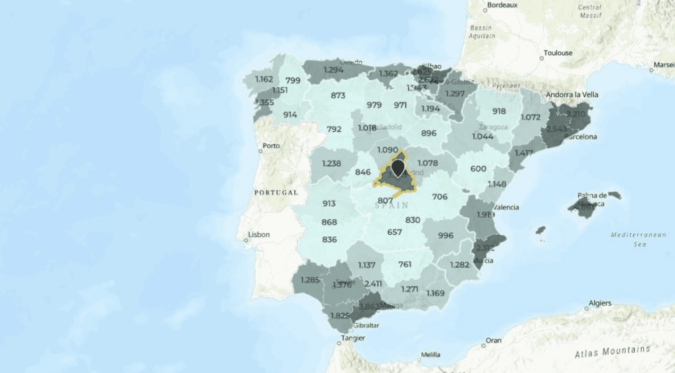 Les logements les plus chers se trouvent aux Baléares avec un prix moyen de 4.660€ par m2, suivies par Malaga qui atteint 3.862 € par m2, tandis que la 3ème place revient à Madrid avec 3.332 € par m2. Viennent ensuite : Guipúzcoa (3.088€ par m2), Santa Cruz de Tenerife (2.628 € par m2), Biscaye (2.625 € par m2), Barcelone (2.543€/m2) et Alicante (2.312€ par mètre carré).
