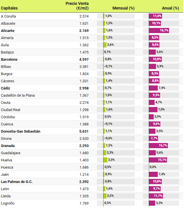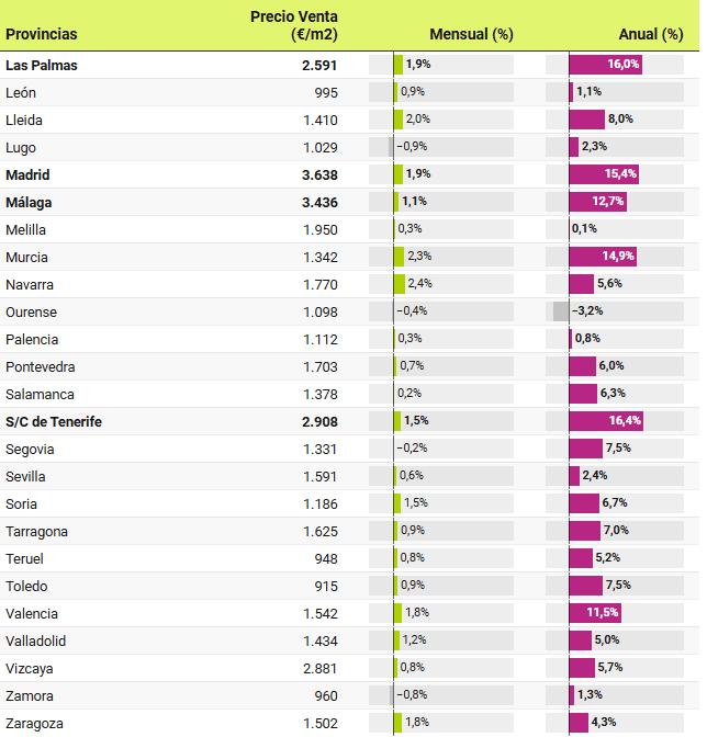 Dans 46 provinces, les prix sont supérieurs à ceux enregistrés il y a un an. Les plus fortes hausses ont été enregistrées à Santa Cruz de Tenerife, où les attentes des vendeurs ont augmenté de 16,4%, suivie de Las Palmas (16%), de la communauté de Madrid (15,4%), de la région de Murcie (14,9%), des Baléares (14,8%), d’Alicante (13,7%) et de Málaga (12,7%). D’autre part, seules 4 provinces ont connu des baisses de prix au cours de l’année écoulée, il s’agit de : Ourense (-3,2%), Cordoba (-2,5%), Badajoz (-1,1%) et Ciudad Real (-0,7%).