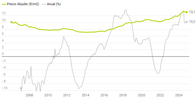 Le mois d’octobre s’est achevé sur une augmentation du prix des loyers en Espagne de 10,2% en glissement annuel et s’établit à 13€/m2, selon le dernier rapport sur les prix publié par idealista. Au cours des 3 derniers mois, le prix a baissé de 0,7%, tandis que le dernier mois a connu une légère augmentation de 0,1%.