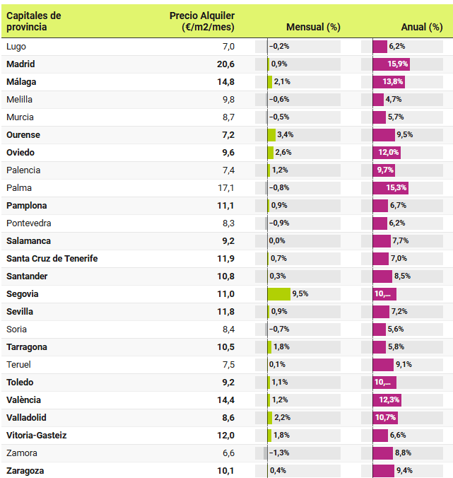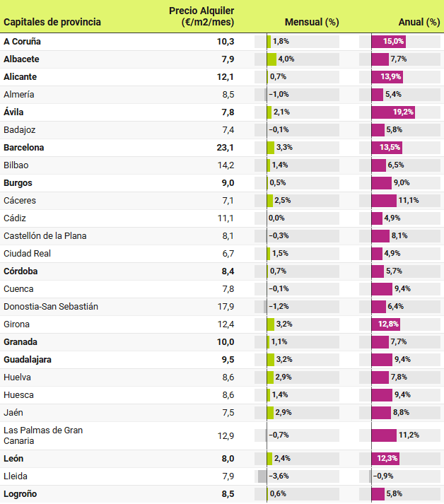 Jusqu’à 50 capitales espagnoles affichent des prix plus élevés qu’en octobre de l’année dernière, à la seule exception de Lleida où les loyers ont baissé de 0,9% au cours de l’année écoulée. La hausse la plus prononcée est celle d’Avila, où les attentes des propriétaires ont augmenté de 19,2%, suivie par Madrid (15,9%), Palma (15,3%) et La Corogne (15%). En revanche, Melilla (4,7%) est la capitale où les loyers ont le moins augmenté au cours de l’année écoulée, suivie de Ciudad Real (4,9%), Cadix (4,9%), Almería (5,4%) et Soria (5,6%).