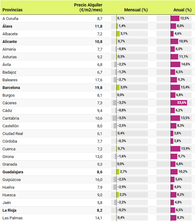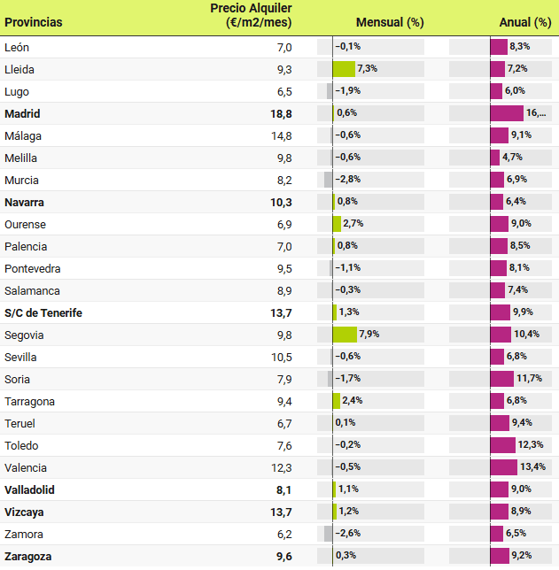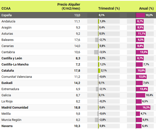 Les loyers ont augmenté dans toutes les régions espagnoles depuis le mois d’octobre de l’année dernière. La Communauté de Madrid est en tête des augmentations (16,3%), suivie par la Cantabrie (13,5%), l’Estrémadure (13,4%), la Communauté de Valence (12%), les Asturies (11,1%), la Catalogne (10,8%) et la Galice (10,4%). Les hausses ont été inférieures à 10% dans les îles Baléares (9,3%), l’Aragon (8,9%), les îles Canaries (8,8%), l’Andalousie (8,7%), la Castille et Léon (8,7%), la Castille-La Manche (7,7%), l’Euskadi (7,6%), la région de Murcie (6,9%), La Rioja (6,5%) et la Navarre (6,4%).