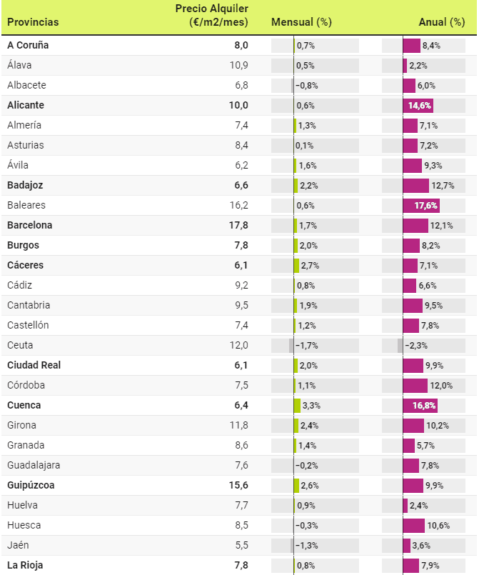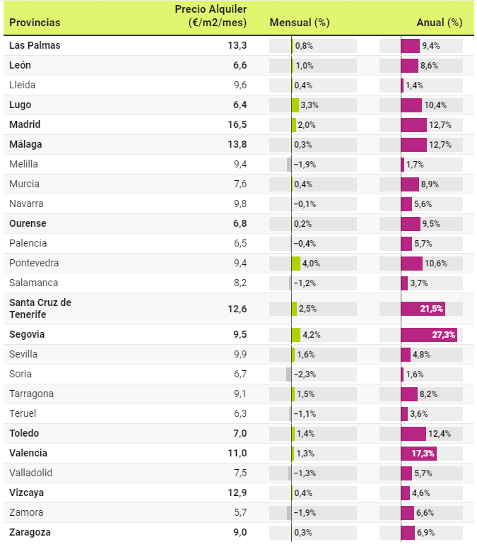 Le prix des loyers a augmenté dans 38 provinces par rapport au mois précédent. Les hausses les plus importantes ont été enregistrées à Segovia (4,2%), Pontevedra (4%), Lugo (3,3%), Cuenca (3,3%) et Cáceres (2,7%). D’autre part, les provinces qui ont connu les plus fortes baisses de loyers sont Soria (-2,3%), Zamora (-1,9%), Jaén (-1,3%), Valladolid (-1,3%) et Salamanca (-1,2%).
