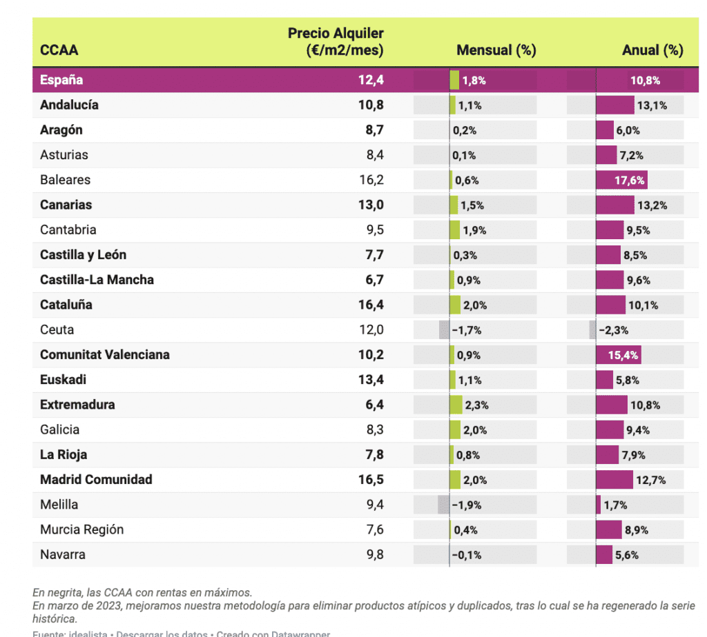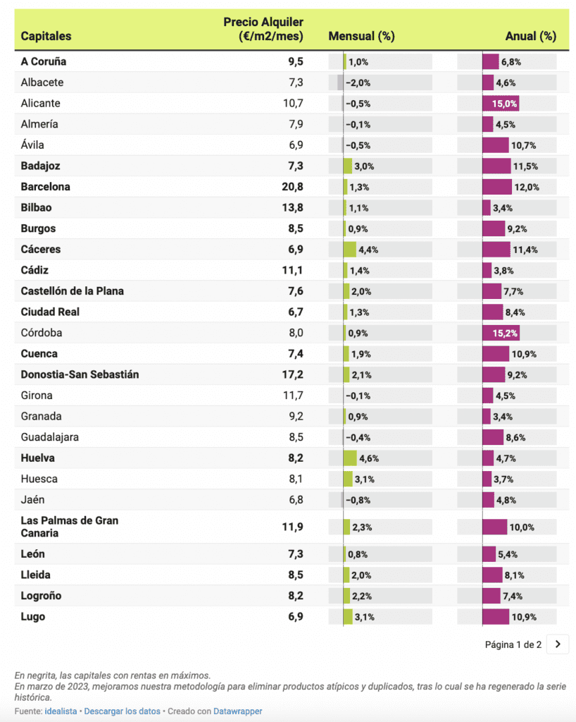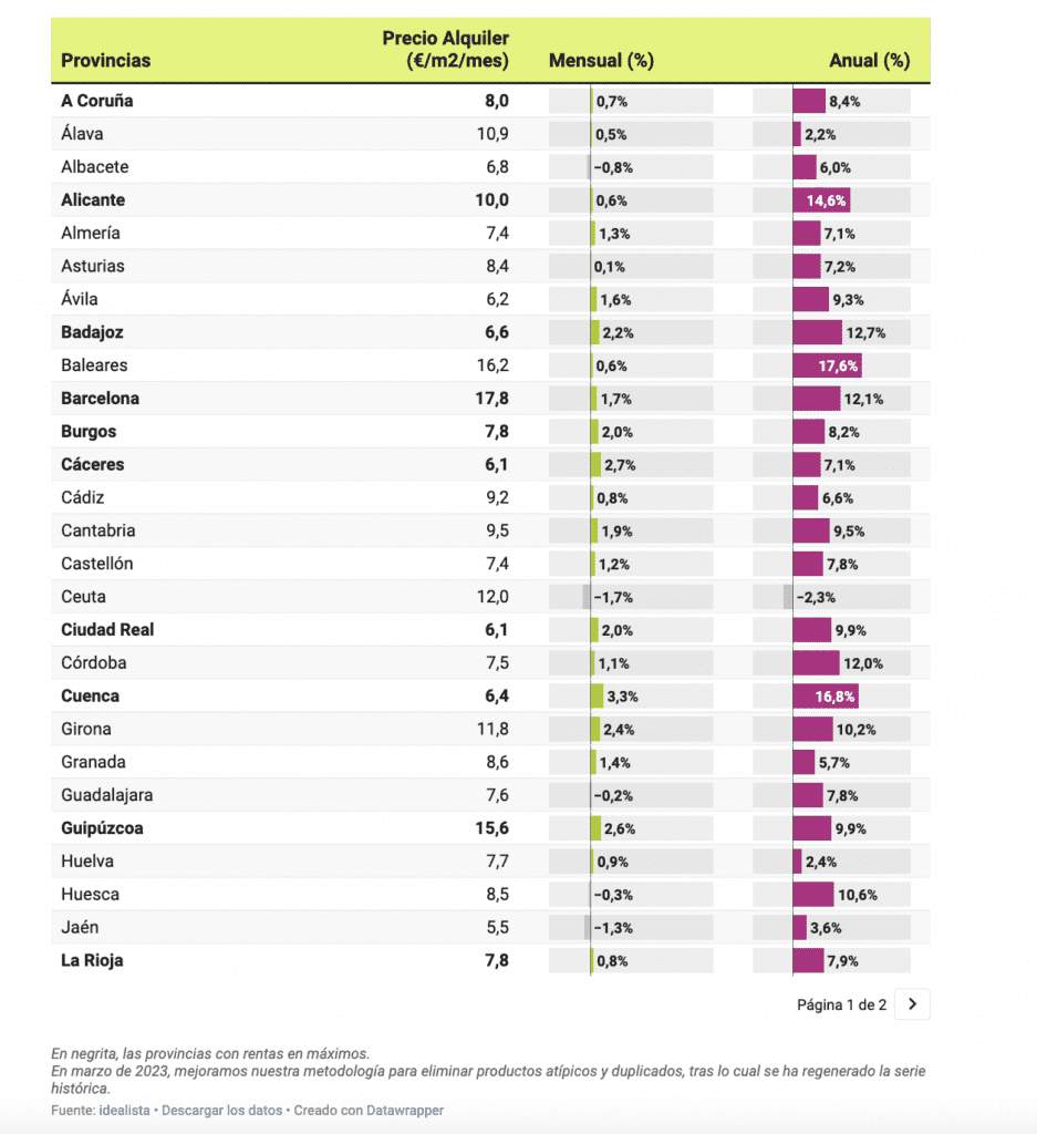 Les loyers ont augmenté dans 16 régions au cours du mois dernier, à la seule exception de la Navarre (-0,1%). L’Estrémadure est en tête des augmentations (2,3%), suivie de la Catalogne (2%), de la Galice (2 %), de Madrid (2%), de la Cantabrie (1,9%), des îles Canaries (1,5%), du Pays basque (1,1%) et de l’Andalousie (1,1%).