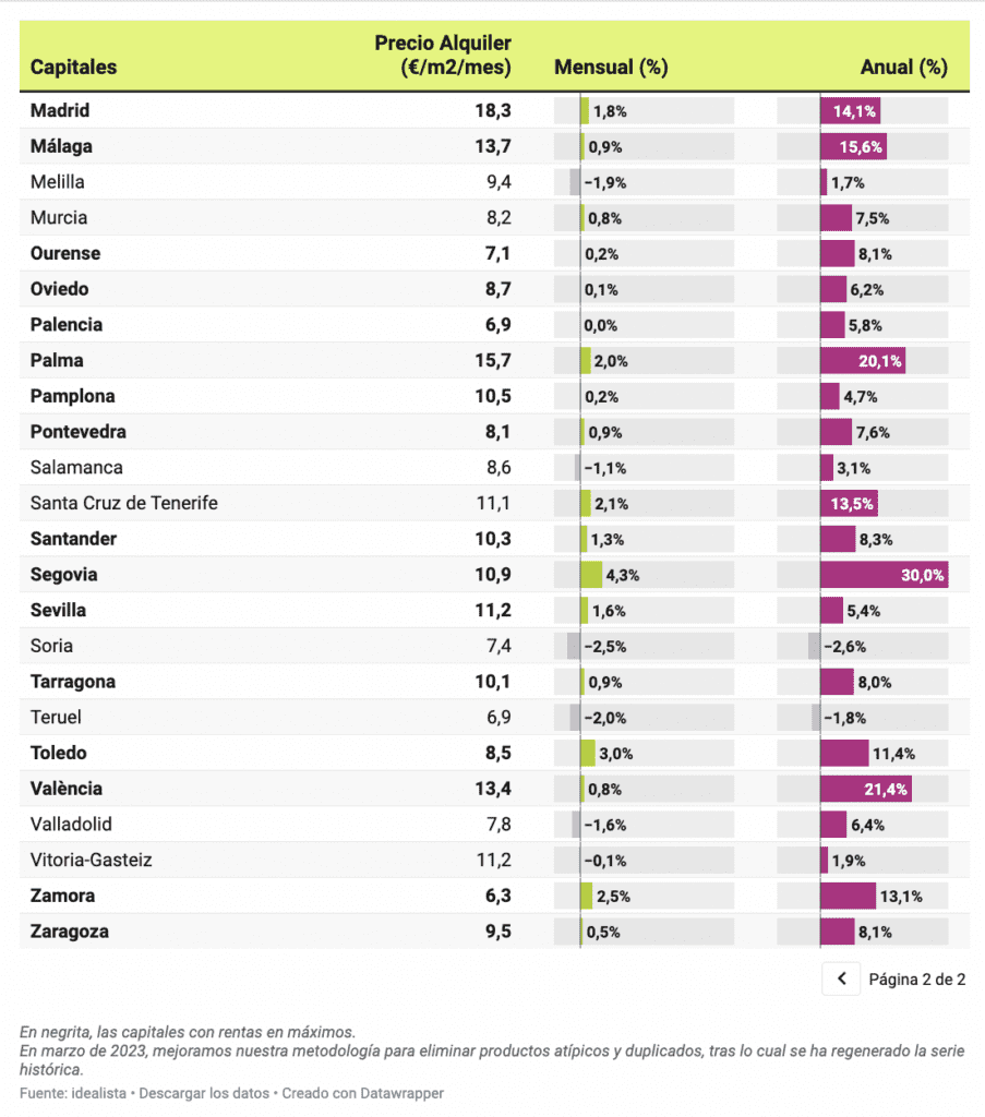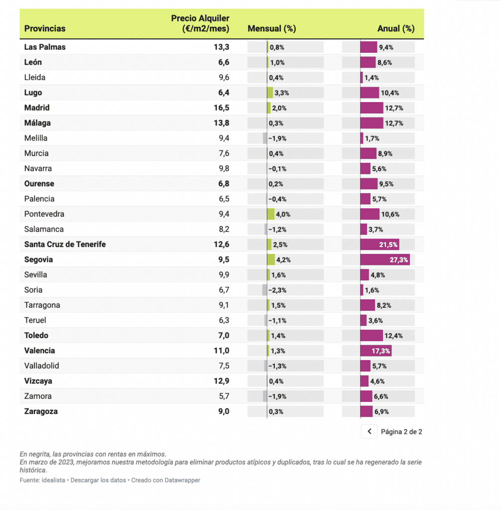 Les hausses les plus importantes ont été enregistrées à Segovia (4,2%), Pontevedra (4%), Lugo (3,3%), Cuenca (3,3%) et Cáceres (2,7%). D’autre part, les provinces qui ont connu les plus fortes baisses de loyers sont Soria (-2,3%), Zamora (-1,9%), Jaén (-1,3%), Valladolid (-1,3%) et Salamanca (-1,2%).