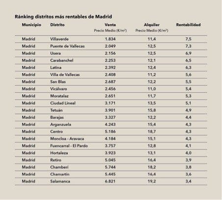 Ainsi, par exemple, investir à Villaverde – le quartier le moins cher de la capitale – est 45,3% plus rentable que dans le quartier le plus cher de Madrid, Salamanca, où le prix au m2 pour l’achat d’un bien immobilier est d’environ 7.000 €/m2 et pour la location de plus de 19 €/m2.