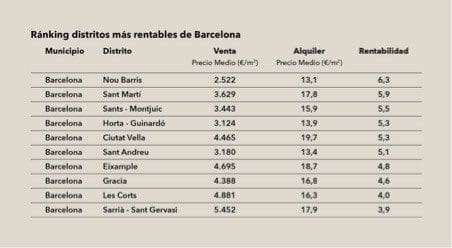 Comparée à la rentabilité d’environ 6% à Nou Barris et Sant Martí, la rentabilité moyenne des logements loués dans les zones privilégiées est d’environ 4%.