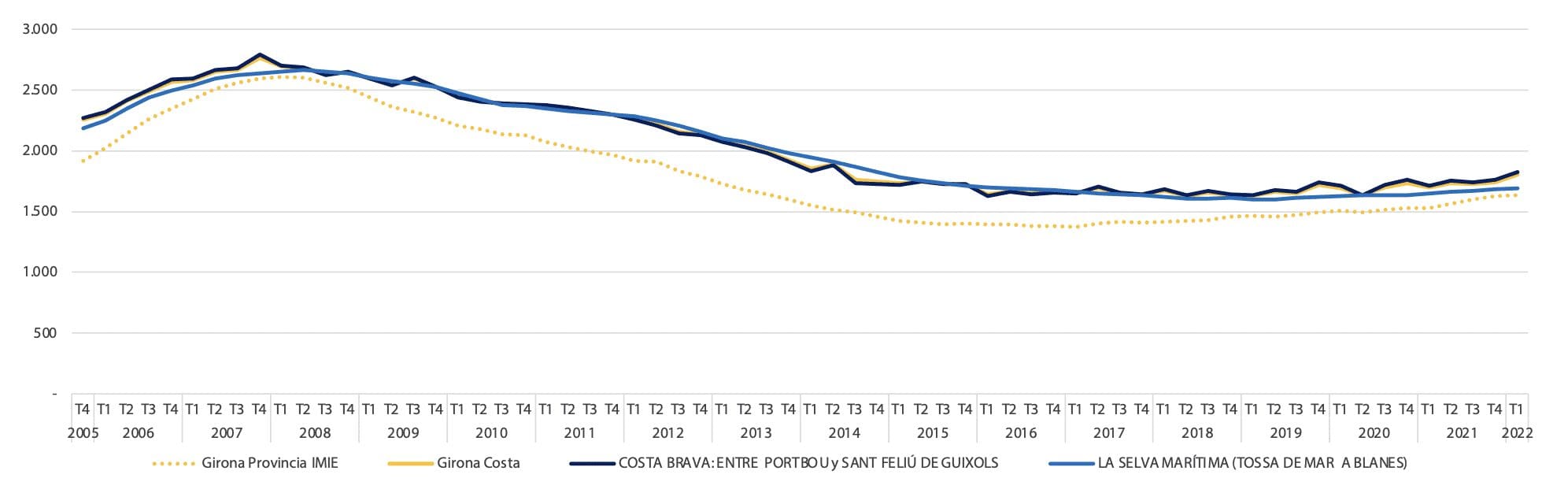 Dans cette région, le prix des résidences secondaires est entre 25% et 60% plus élevé que celui des résidences principales. Le prix moyen des résidences secondaires est de 2.250 €/m2 sur la Costa Brava et de 2.800 €/m2 sur la Selva Marítima, alors que le prix moyen général est de 1.802 €/m2 dans les communes côtières de Gérone.