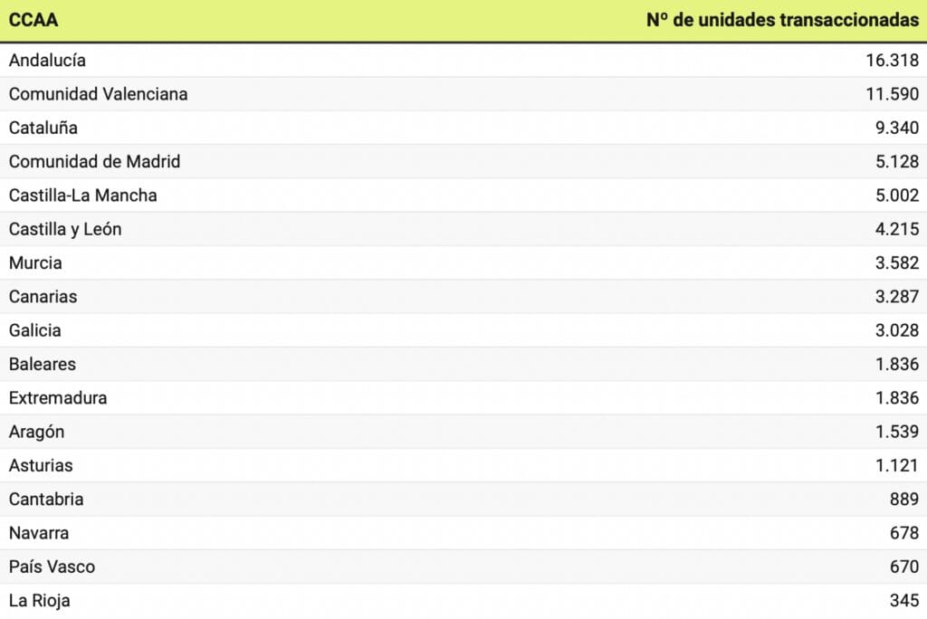 Selon les données des notaires, les régions autonomes où ont eu lieu le plus de transactions de pavillons sont l’Andalousie (16.318) et Valence (11.590), qui représentent près de 40 % du total des ventes dans le pays entre janvier et mai. Les régions les plus importantes en termes de transactions sont ensuite la Catalogne (avec 9.340 accumulations), Madrid (5.128), Castille-La Manche (5.002) et Castille et Léon (4.215). La Cantabrie, la Navarre, le Pays basque et La Rioja ferment le classement national avec moins de 1.000 ventes de pavillons au cours des cinq premiers mois de l’année.