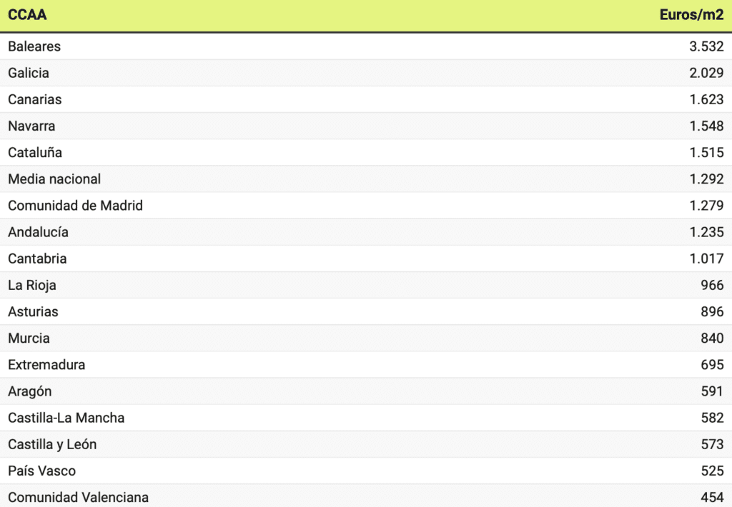 Selon les notaires, le prix moyen au m2 des maisons individuelles entre janvier et mai est supérieur à la moyenne nationale dans cinq régions autonomes : les Baléares (3.252 euros/m2), la Galice (2.029 euros/m2), les Canaries (1.623 euros/m2), la Navarre (1.548 euros/m2) et la Catalogne (1.515 euros/m2). Quant aux prix les plus bas, ils se trouvent en Aragon, en Castille-et-León, en Castille-La-Manche, au Pays Basque et dans la Communauté Valencienne, avec une moyenne inférieure à 600 euros par m2.