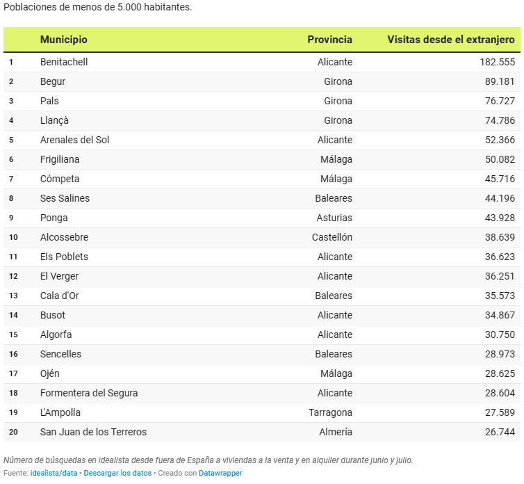 Selon une étude réalisée par idealista, la place de marché immobilière du sud de l’Europe, en analysant les visites reçues dans sa base de données au cours des mois de juin et juillet, Benitachell (Alicante) est la ville qui enregistre le plus grand nombre de recherches de biens immobiliers en provenance de l’étranger. Les 3 places suivantes reviennent à des villes de la région de Gérone : Begur, Pals et Llançà. Le podium des 5 premières places est complété par la municipalité d’Alicante, Arenales del Sol.
